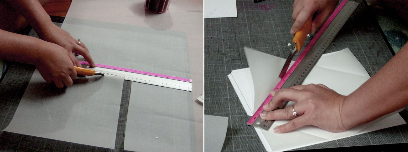 1. Create a template for the tracing paper/vellum. I used my old drawing block as the template. After a few attempts to get the right template, I am satisfied with my crisp looking template!- 9 inch square doilies