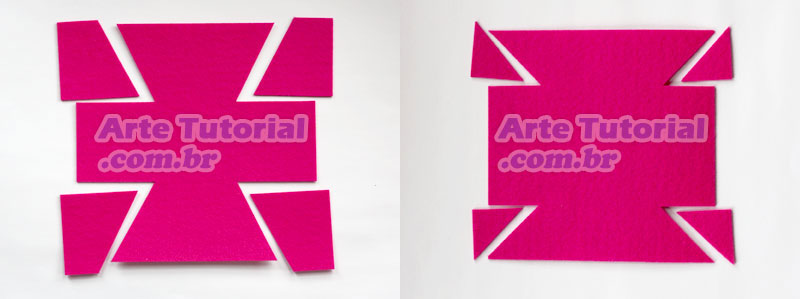 "Primeiro é necessário fazer os cortes indicados a seguir: parte de baixo e parte da tampa. Você pode riscar diretamente no feltro usando as medidas descritas ou imprimir e usar a folha como molde. Depois de feito o desenho, recorte as peças."