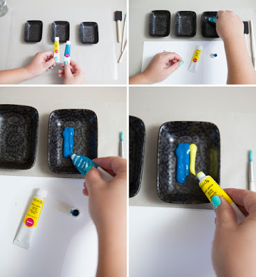 A moça do blog somethingtorquoise tentou fazer a tinta turquesa, daí ela ter feito misturas: