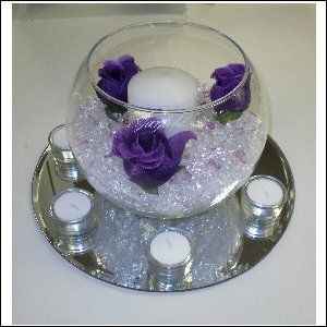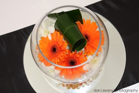 Vidros de aquário com gérberas: fica uma decoração bem econômica, já que vão poucas gérberas por aquário: