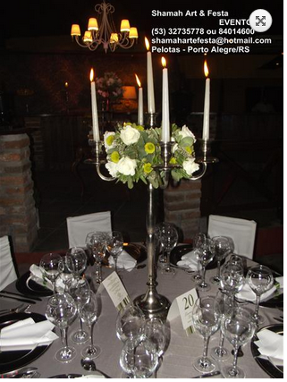 Castiçais (o aluguel deles é bem acessível) - não precisa colocá-los em todas as mesas. Novamente sousplats prateados.